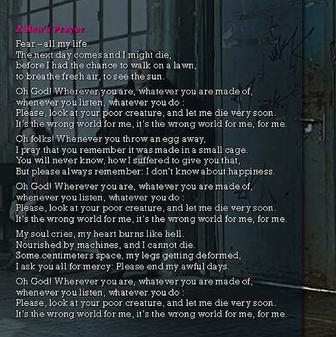 Une chanson vraiement hors-ligne avec un texte, que vous avais jamais entendu dans une chanson de rock. Une poule raconte plaignante dans une batterie, sa fatalité de vie indigne et prie à dieu, de finalement la sauver.